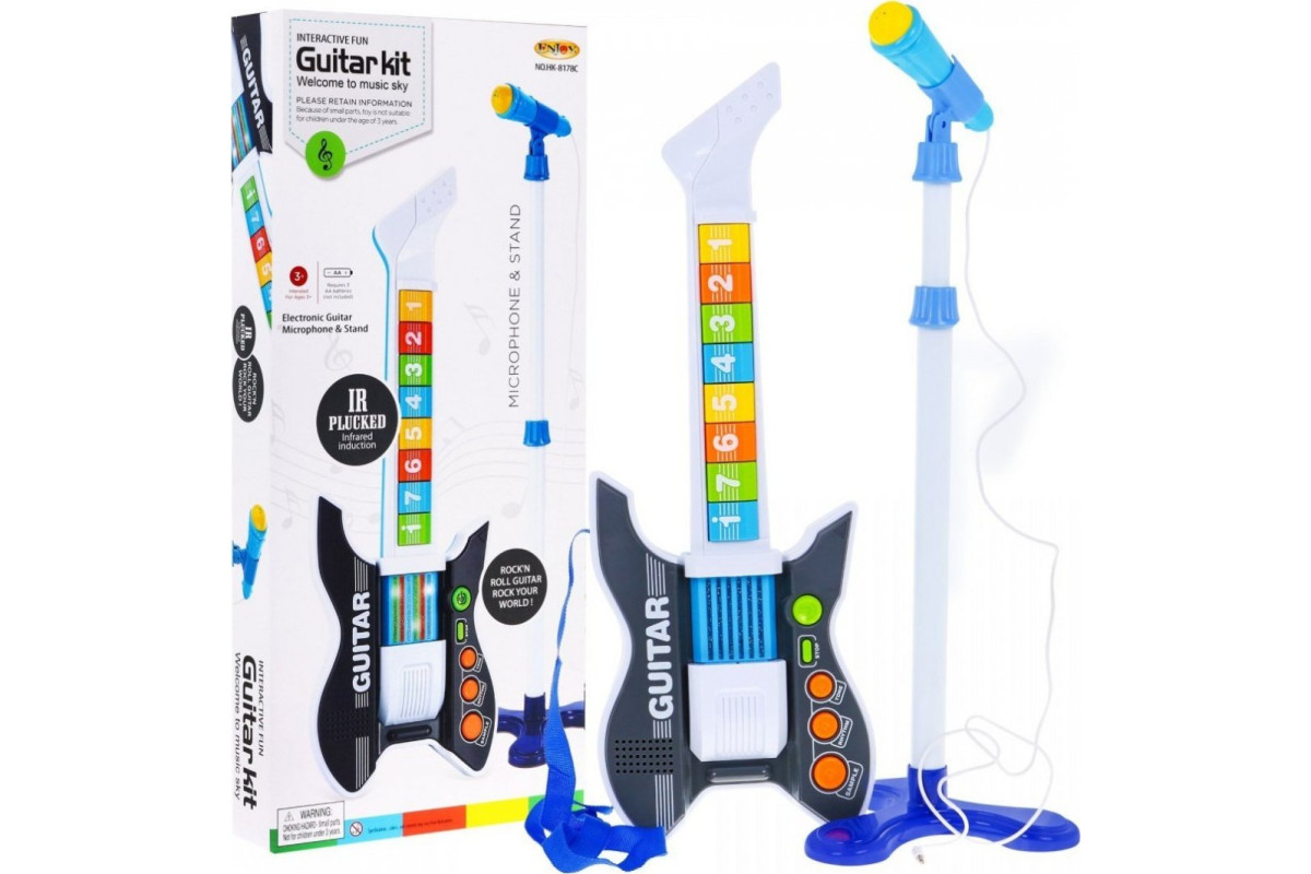 Барвиста електрогітара підходить для дітей від 3 років. Музична іграшка має безліч інтерактивних функцій , які неодмінно сподобаються маленьким музикантам. Інструмент також містить мікрофон. Розміщується на зручному штативі з можливістю регулювання висоти та положення мікрофона.