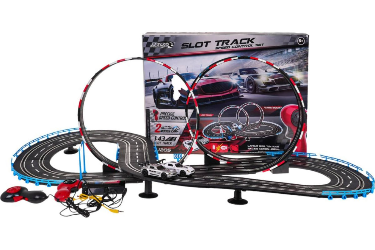 У набір входять 2 гоночні машини, 2 пульти дистанційного керування та USB-кабель живлення. Крім того, траса пропонує дві швидкості водіння, регулюючи рівень хвилювання відповідно до віку та навичок гравців. Для роботи необхідні батарейки 6 x AA 1,5 В (не входять в комплект).