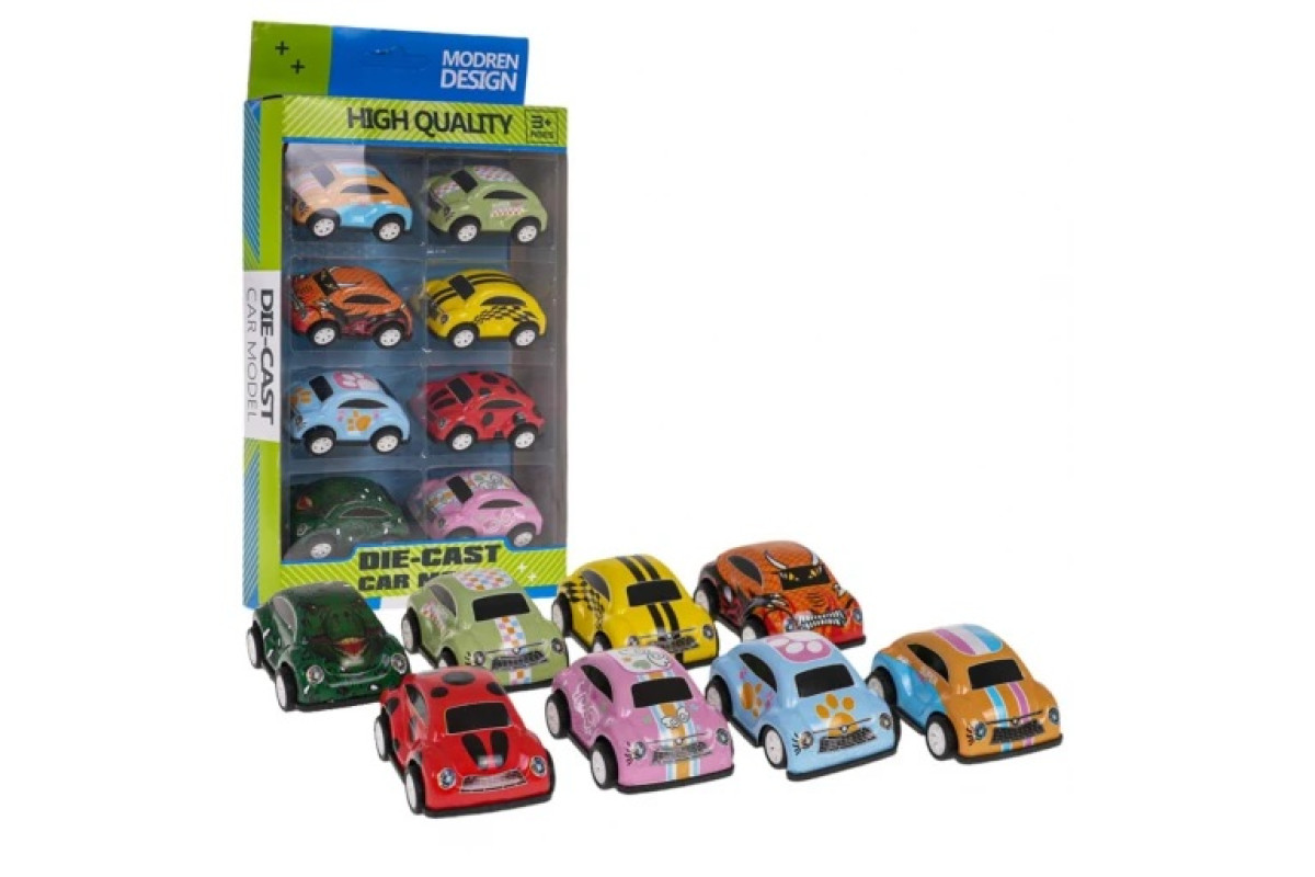 Набір з 8 моторних машинок - пропозиція для маленьких любителів автомобілів від 3 років. Кожна іграшкова машина, стилізована під класичний Жук , виготовлена з міцних матеріалів і має металевий кузов яскравих кольорів, що привертає увагу дитини.