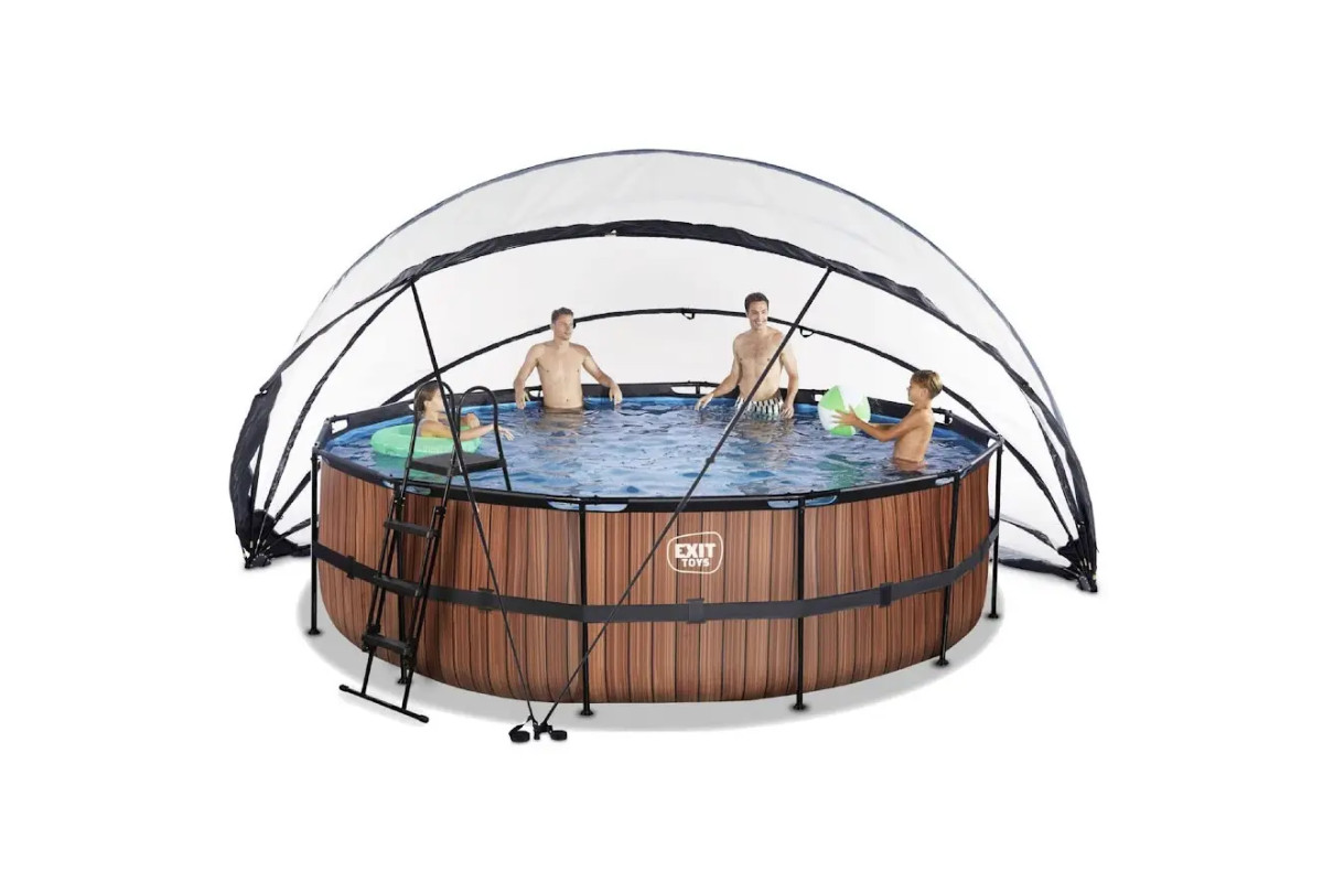Басейн каркасний EXIT з накриттям 450 х 122 см "дерево" з нагрівом води виглядає лаконічно і елегантно. Із зовнішнього боку - тканина із забарвленням у вигляді дерев'яної стіни, що зробить його розміщення в саду, на дачі або у дворі будинку особливо естетичним. У стандартну комплектацію входить насос з піщаним фільтром, сходи для басейну і купол (накриття для басейну EXIT ECO ø550 см..