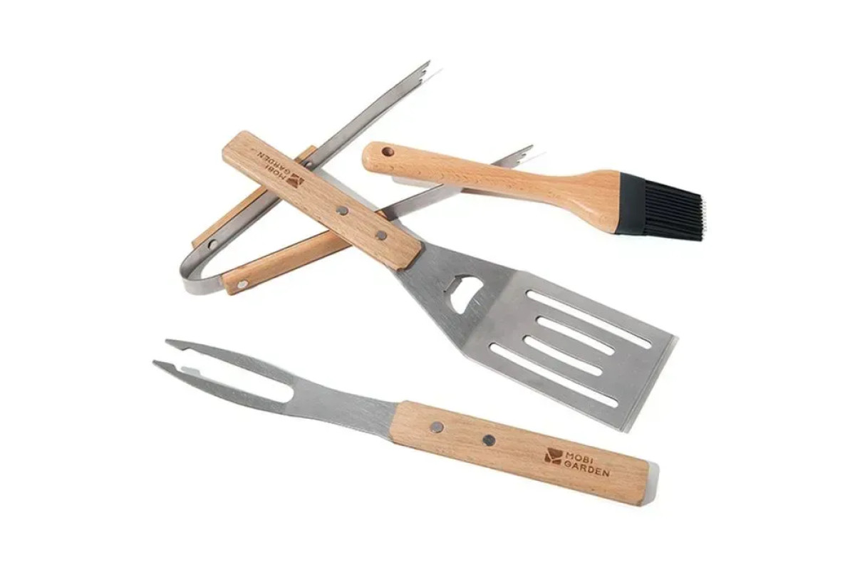 Інструменти, що входять до комплекту, вироблені з якісної нержавіючої сталі марки 430, яка славиться своєю зносостійкістю та тривалим терміном служби. Цей матеріал не схильний до корозії та легко піддається чищенню, що гарантує високу довговічність кожного елементу набору. Ручки інструментів виготовлені з екологічно чистого бука, що не лише м'який і приємний на дотик, але й надає виробам особливу естетику. Дерев'яна текстура забезпечує комфортне та міцне утримання, що робить процес кулінарії більш приємним. У комплект входить: вилка, кисть для соусів, лопатка та щипці, які є незамінними для створення ідеального барбекю.