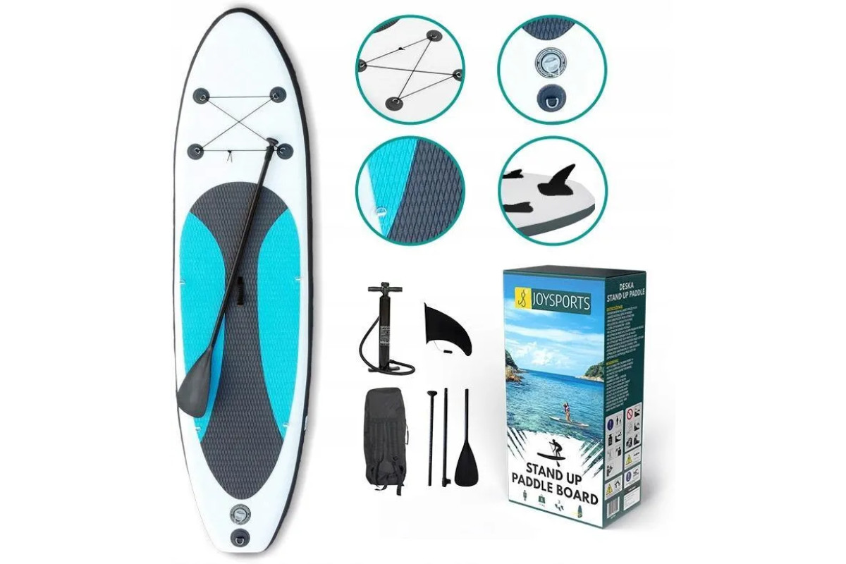 Модель JoySports має алюмінієве весло з регульованою довжиною від 165 до 208 см, яке плаває на воді та складається з трьох частин — зручно як для зберігання, так і для перевезення. Спеціальний клапан дозволяє швидко накачати або здути дошку, а кріплення з нержавіючої сталі дає змогу зафіксувати страхувальний ремінь (ліш) для додаткової безпеки (ліш у комплект не входить).