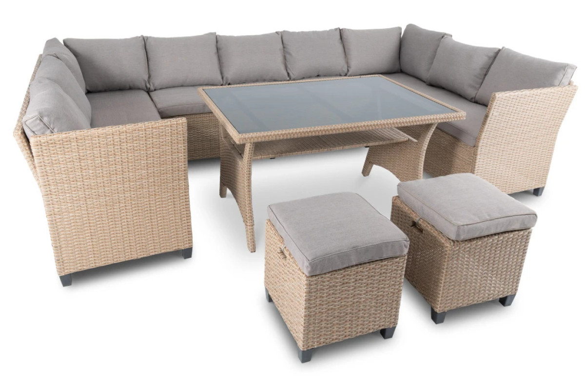 Меблевий гарнітур Livorno від Di Volio - чудовий вибір для вечірок на свіжому повітрі. Це садові меблі відмінно підходять для саду, і тераси. Комплект складається з подвійного кутового дивану на 9 місць, великого столу зі стільницею із загартованого скла і 2 пуфів. Завдяки використанню якісного плетіння з ротангу, меблі естетичні, функціональні і в той же час зручні. Сидіння дивану і пуфи оснащені м'якими і зручними подушками графітового кольору. Нейтральний сірий колір поліротанга в цьому наборі надає йому сучасний характер.