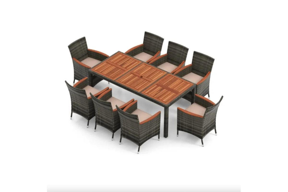 Відпочинок на свіжому повітрі набуває нового значення з садовим комплектом Costway Viccos 8+1. Це не просто меблі - це атмосфера затишку, естетики та турботи про кожну деталь вашого патіо, тераси чи саду. Виготовлений із міцного поліетиленового ротанга, натурального дерева акації та армованого металу, цей обідній набір поєднує в собі стійкість до погодних умов, стильний вигляд і зручність щоденного використання. До комплекту входить великий стіл із отвором для парасолі та вісім стільців із м'якими подушками, що перетворюють кожен прийом їжі на вишукану насолоду. Ідеальне поєднання натуральної текстури, приглушених кольорів та продуманої ергономіки робить цей набір справжньою перлиною будь-якого відкритого простору.