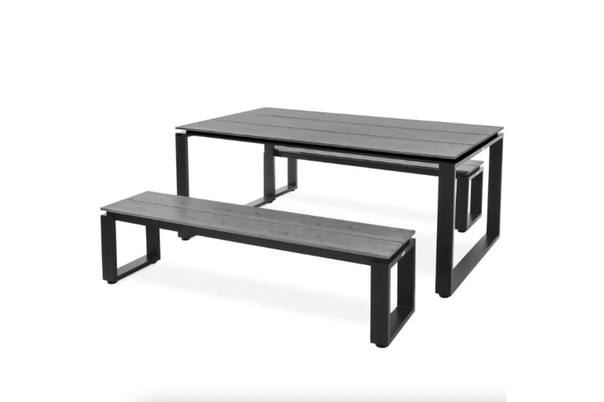 Уявіть собі ідеальну атмосферу у вашому саду чи на терасі: теплі вечори, сімейні зустрічі, смачні страви та розмови, які тривають до пізньої ночі. Комплект меблів Trento від Di Volio - це не просто меблі, а функціональне рішення для створення затишного простору, де кожен момент сповнений комфорту. Стильний дизайн, великий обідній стіл та дві зручні лавки забезпечують ідеальні умови для відпочинку з рідними та друзями. Поєднання сучасного мінімалізму та традиційних мотивів робить цей набір універсальним доповненням для будь-якого екстер'єру. Міцний алюмінієвий каркас із матовим чорним покриттям надає меблям елегантності, а натуральний відтінок поліуретанової деревини додає тепла та гармонії. Завдяки стійкості до вологи, сонячних променів і температурних змін, Trento прослужить вам довгі роки, зберігаючи свій розкішний вигляд. Зручна, містка стільниця забезпечує достатньо місця для трапез, святкових вечорів або просто відпочинку за чашкою кави. Лавки, підібрані в тон столу, створюють єдиний гармонійний ансамбль, а їхня ергономічна конструкція дарує справжній комфорт. Trento - це не просто меблі, а стильний центр вашого саду або тераси!