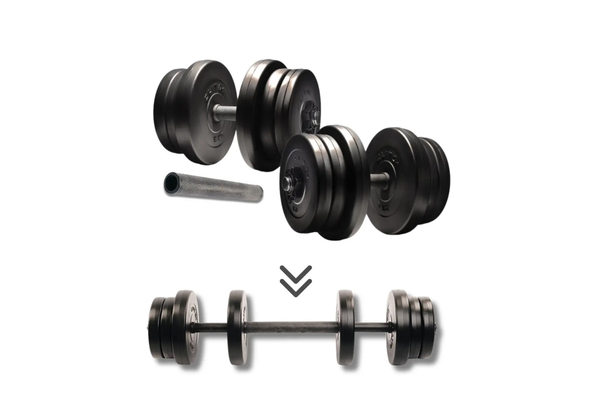 Розбірні гантелі Elitum 2 х 21 кг — це універсальне тренувальне обладнання. Завдяки подовжувачу грифа цей набір гантелей пропонує ще більше можливостей: ви можете використовувати їх як окремі гантелі для ізольованих вправ або трансформувати у штангу для роботи з великими навантаженнями.