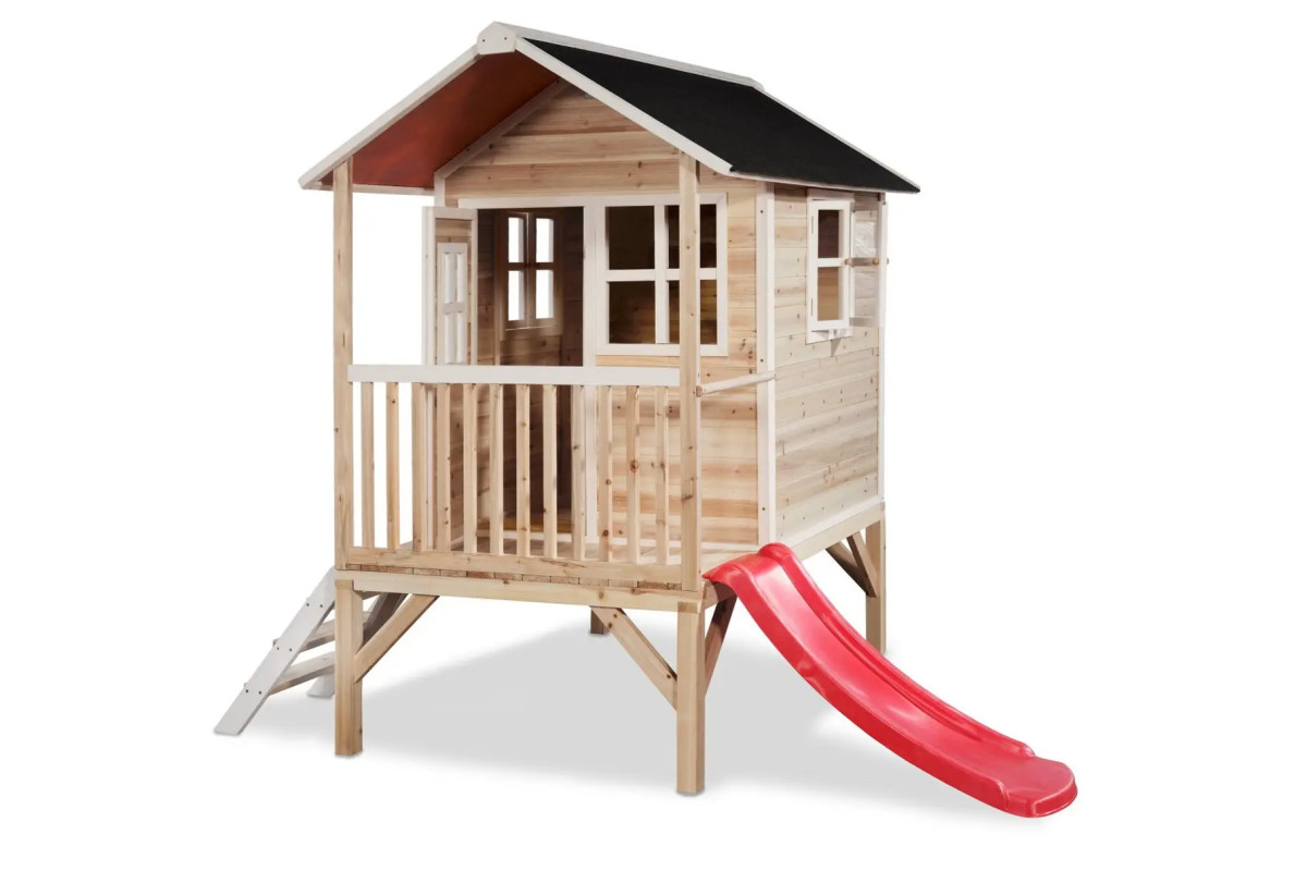 Дитячий вуличний будиночок з дерева, EXIT Loft 300, натуральний – втілення затишку та веселощів для дітей Пориньте у світ яскравих пригод з цим стильним ігровим будиночком, виконаним в елегантному скандинавському стилі. Натуральний колір та білі рами створюють відчуття простору та свіжості, а продумана конструкція з попередньо зібраними елементами забезпечує швидке та легке складання. Будиночок встановлено на сваях, а зручна сходи та можливість кріплення гірки з будь-якого боку (зліва або справа) дозволяють організувати простір за вашим бажанням. Екологічність та надійність Виготовлений із сертифікованої FSC® деревини кипариса, будиночок гарантує безпеку та довговічність. Це дерево стійке до впливів погодних умов і не схильне до тріщин, що робить конструкцію надійною навіть при тривалій експлуатації. Водонепроникна бітумна покрівля захистить будиночок від дощу, дозволяючи дітям насолоджуватись грою за будь-якої погоди – без необхідності додаткової обробки! Такий будиночок не лише прикрасить сад, але й стане центром незабутніх дитячих пригод на свіжому повітрі! Вибирайте якість та стиль від EXIT Toys – і кожна гра стане незабутньою пригодою! Характеристики: Довжина: 269 см (з урахуванням виступу гірки) Висота: 215 см Ширина: 190 см Вага: 121 кг Матеріал виготовлення: деревина кипариса Тип конструкції: попередньо зібрані панелі Дах будиночка: водонепроникний, матеріал виготовлення – бітум, колір – чорний Гірка: довжина – 118 см, червона, висота платформи для спуску – 56 см Гарантія на дерево: 12 місяців Товар постачається в 6-ти коробках, загальною вагою 121 кілограм. 1. Розміри (Д x Ш x В) - 157.5 x 119 x 7.5 см Вага – 21 кг 2. Розміри (Д x Ш x В) – 121.5 x 112.5 x 9.5 см Вага - 19 кг 3. Розміри (Д x Ш x В) – 187.5 x 84 x 9 см Вага - 32 кг 4. Розміри (Д x Ш x В) – 126 x 62 x 16 см Вага - 19 кг 5. Розміри (Д x Ш x В) – 173 x 28 x 14 см Вага - 19 кг 6. Розміри (Д x Ш x В) - 120 x 38 x 38 см Вага – 3 кг Обирайте якість і стиль від EXIT Toys – і кожна гра стане незабутньою пригодою!