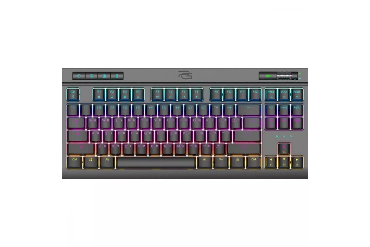 Особливості. Клавіатура має розмір 85%, а це означає, що аксесуар не оснащений блоком NUM-пада. Однак на верхній панелі, біля фірмового логотипа Proove Gaming (PG), розташовані функціональні клавіші, якими можна регулювати увімкнення та вимкнення комп'ютера, режим сну, довідник та калькулятор, а також керування звуком. Технологія Hot-Swap на клавіатурі дозволяє легко замінювати перемикачі без необхідності пайки, забезпечуючи зручність налаштування та обслуговування.