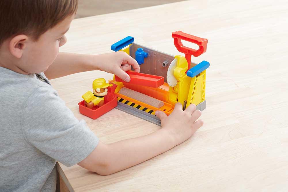 До набору входить дриль і рухома торцювальна пила, які імітують справжню роботу будівельних інструментів. Діти можуть формувати блоки з піску, свердлити отвори та "розпилювати" їх, створюючи власні конструкції. 85 грамів кінетичного піску легко формуються, не висихають і можуть використовуватись знову та знову. Такий формат гри стимулює уяву та забезпечує захопливий сенсорний досвід.