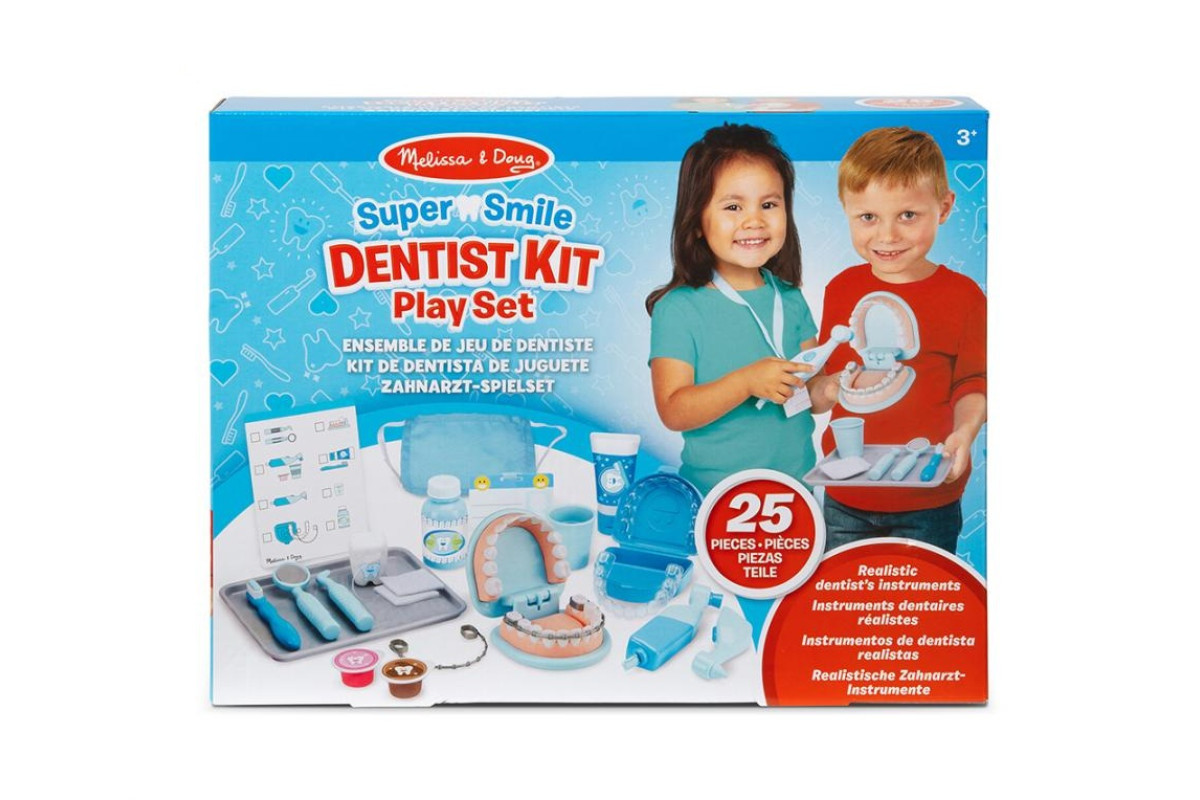 До набору входить 25 предметів, серед яких – стоматологічне дзеркальце, щипці, зонд, флос, тюбик із пастою, пляшечка з ополіскувачем, щітка, стаканчик, ватні диски, а також дві пластини з брекетами. Маленькі стоматологи можуть "свердлити" або полірувати зуби за допомогою віброінструмента, а потім видати пацієнту усмішку без карієсу. Для завершення образу є маска та бейджик стоматолога, а багаторазова картка-завдання допоможе відстежувати "лікування".