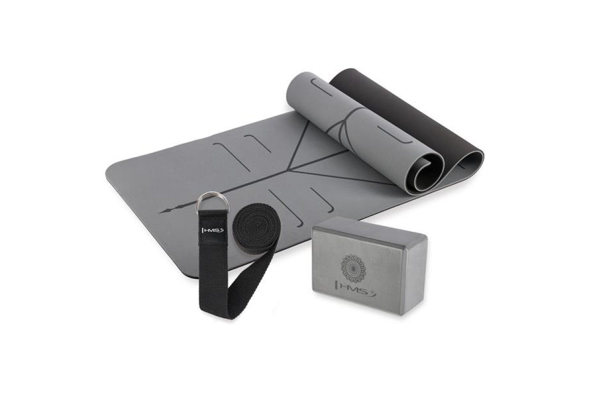Килимок для йоги HMS YM10 з блоком KJ02 та ременем SJ02, сірий