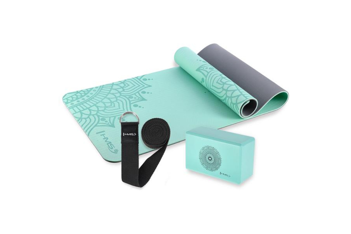 Килимок для йоги HMS YM10 з блоком KJ02 та ременем SJ02, м'ятний