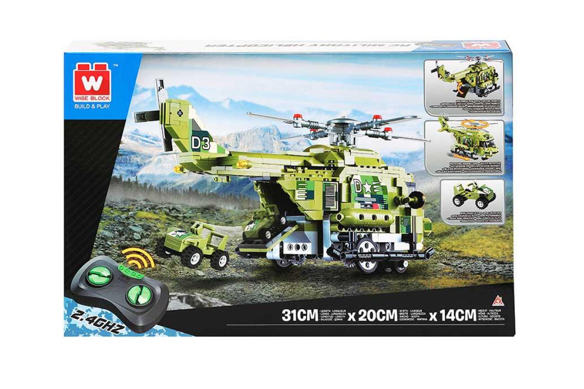 Машина-конструктор делюкс на дистанційному керуванні "Військовий гелікоптер" - це набір, що включає в себе 676 елементів. Пульт з радіочастотою 2,4 ГГц і високопродуктивний двигун дозволяють вправно керувати транспортними засобами для ігор на вулиці та в приміщенні. Набір дає можливість зібрати вертоліт, а також машинку, яка вантажиться до гвинтокрила.