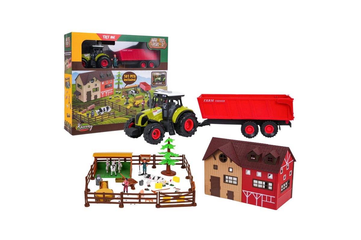 Трактор має від'ємний причіп з можливістю підйому, що дозволяє завантажувати та транспортувати фігурки або тварин. Доповненням є відкриваються двері сараю та загон, які допомагають дитині розігрувати сценки та створювати власні історії. Все виготовлено з міцного, безпечного пластику в яскравих кольорах.