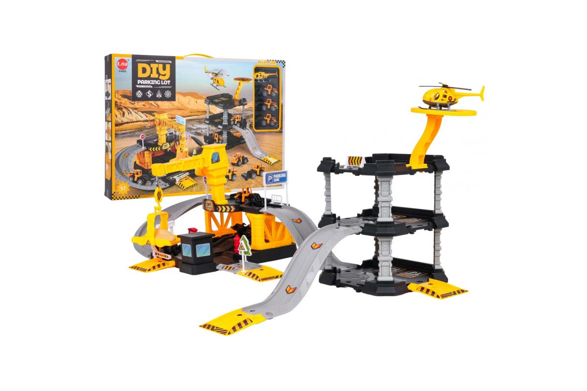 У комплекті є три металеві будівельні машини з рухомими елементами – екскаватор, навантажувач і автомобіль з молотом – а також вертоліт. Будівельний майданчик обладнаний ручним краном з гаком і гіркою для транспортних засобів. З'єднаний з ним паркінг має три рівні, паркувальні місця та майданчик для вертольота. Всі компоненти виготовлені з високоякісного пластику, стійкого до інтенсивного використання. Окремі частини легко з'єднуються між собою, утворюючи стабільне та естетичне ціле.