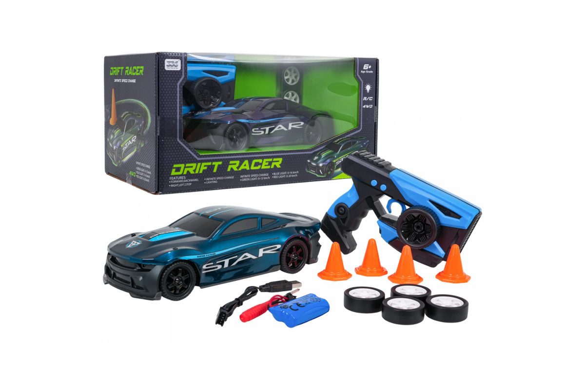 У комплекті є змінні колеса для дрифту та гумові шини для класичної їзди, а також 4 конуси, що полегшують тренування навичок. Транспортний засіб живиться від акумулятора 7,4 В, що входить до комплекту, а пульт дистанційного керування потребує 2 батарейок AA, які не входять до комплекту.