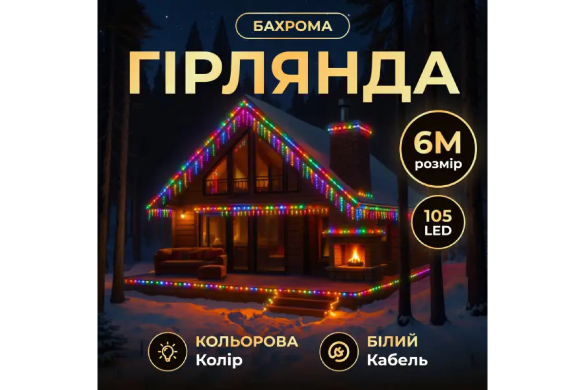 Гірлянда «Бахрома» зі 105 LED лампочками створює атмосферне освітлення для зовнішнього або внутрішнього декору. Довжина основного шнура становить 6 метрів, що дозволяє прикрашати фасади будинків, вікна, балкони, альтанки чи вітрини. Завдяки білій нитці гірлянда непомітна вдень і виглядає акуратно при монтажі, а в темний час доби рівномірно розсіює світло, створюючи святкову ілюмінацію.