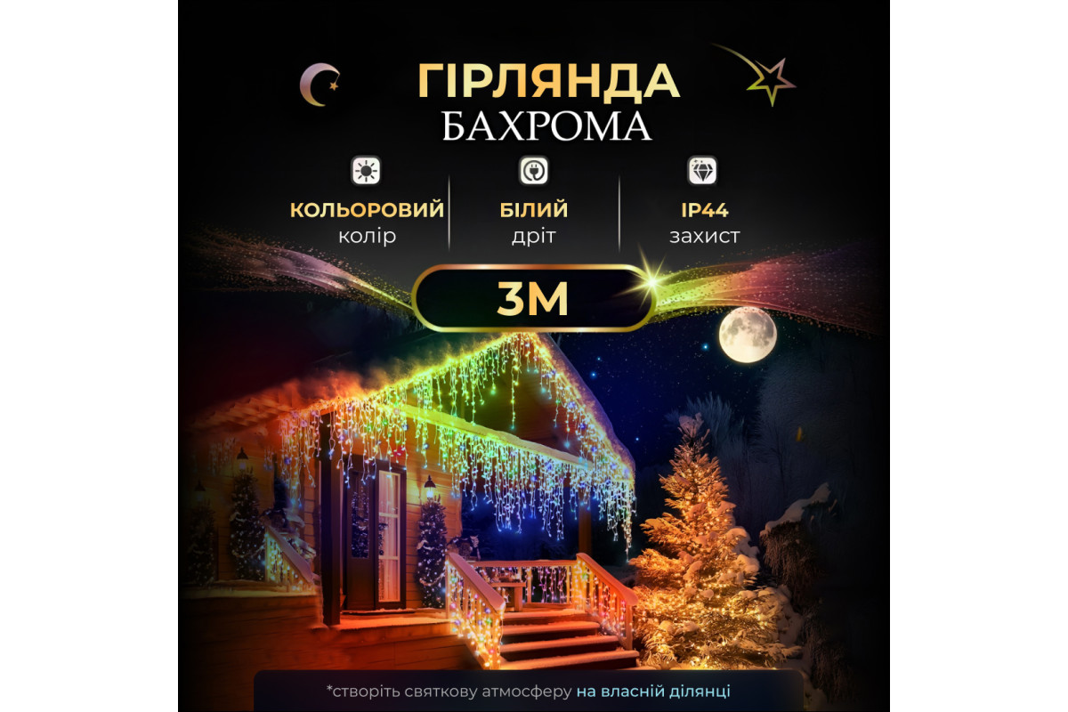 Вулична гірлянда Бахрома — чудовий вибір для тих, хто хоче створити святкову атмосферу на власній ділянці, привернути увагу оточення до кафе чи ресторану, оформити дерева або ґанок будинку. Вона дає змогу створювати чудові світлові ефекти завдяки роботі в технології флеш.