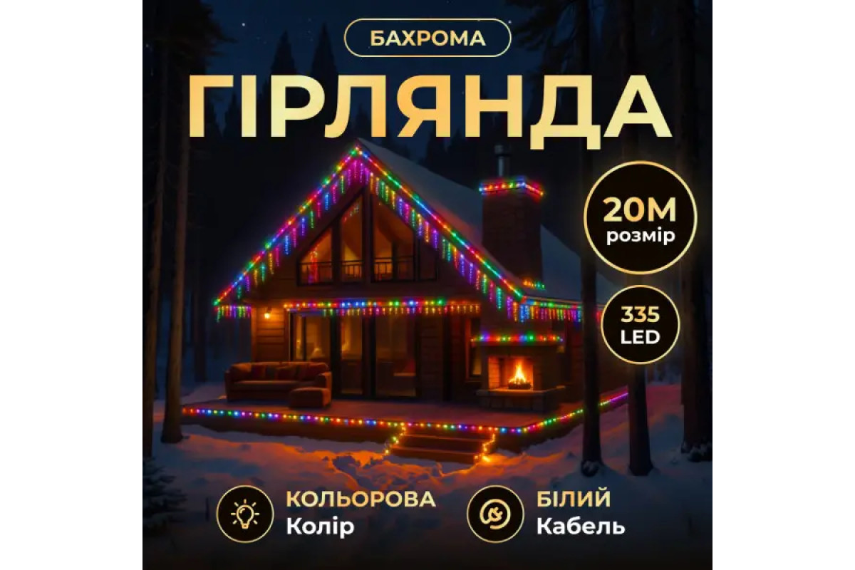 Гірлянда «Бахрома» з 335 LED лампочками створює атмосферне освітлення для зовнішнього або внутрішнього декору. Довжина основного шнура становить 20 метрів, що дозволяє прикрашати фасади будинків, вікна, балкони, альтанки чи вітрини. Завдяки білій нитці гірлянда непомітна вдень і виглядає акуратно при монтажі, а в темний час доби рівномірно розсіює світло, створюючи святкову ілюмінацію.