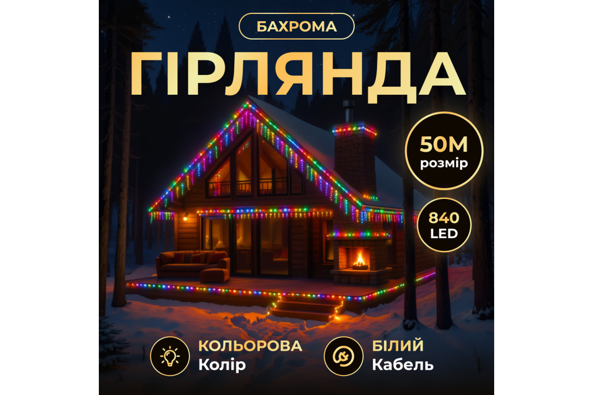 Гірлянда «Бахрома» з 840 LED лампочками створює атмосферне освітлення для зовнішнього або внутрішнього декору. Довжина основного шнура становить 50 метрів, що дозволяє прикрашати фасади будинків, вікна, балкони, альтанки чи вітрини. Завдяки білій нитці гірлянда непомітна вдень і виглядає акуратно при монтажі, а в темний час доби рівномірно розсіює світло, створюючи святкову ілюмінацію.