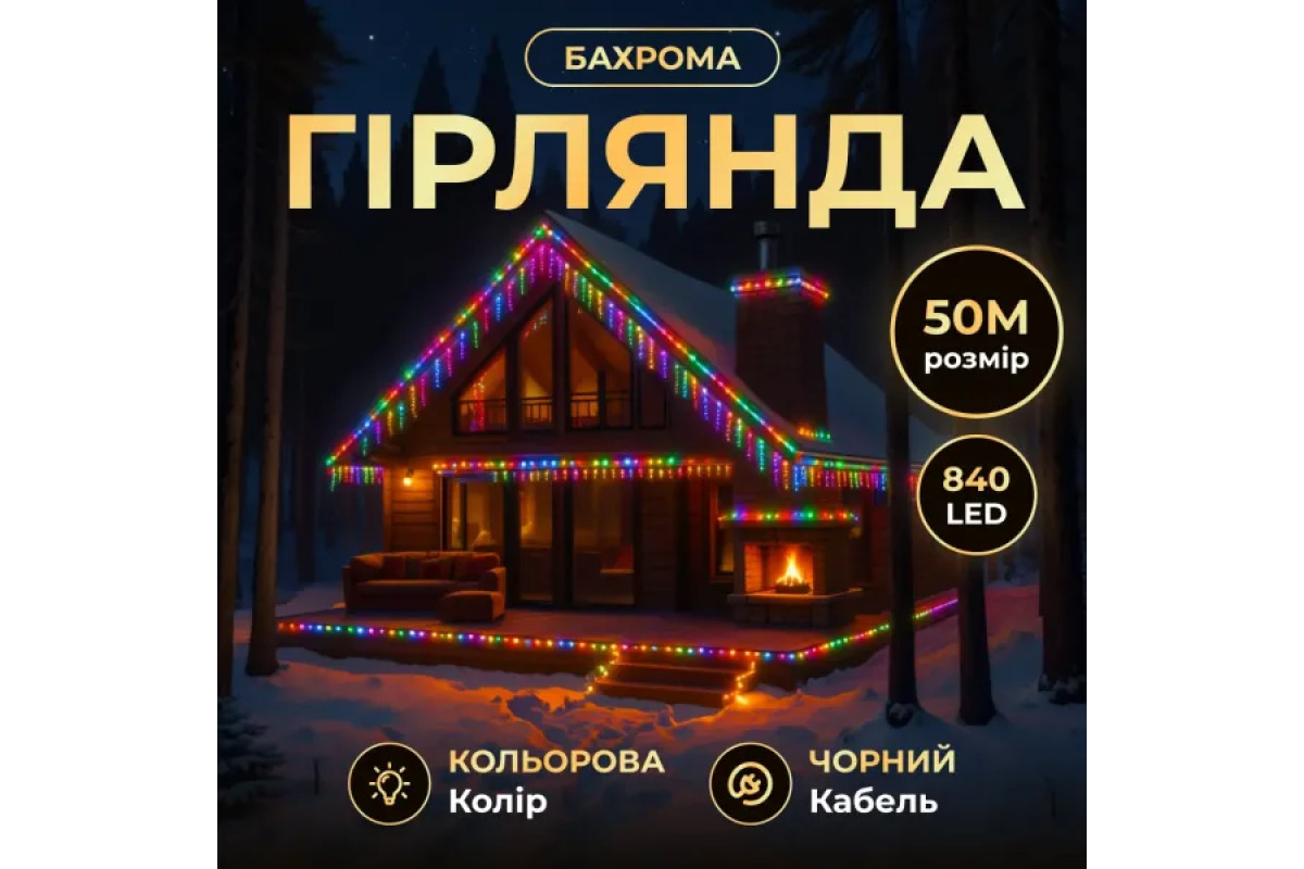 Гірлянда «Бахрома» з 840 LED лампочками створює атмосферне освітлення для зовнішнього або внутрішнього декору. Довжина основного шнура становить 50 метрів, що дозволяє прикрашати фасади будинків, вікна, балкони, альтанки чи вітрини. Завдяки чорній нитці гірлянда непомітна вдень і виглядає акуратно при монтажі, а в темний час доби рівномірно розсіює світло, створюючи святкову ілюмінацію.