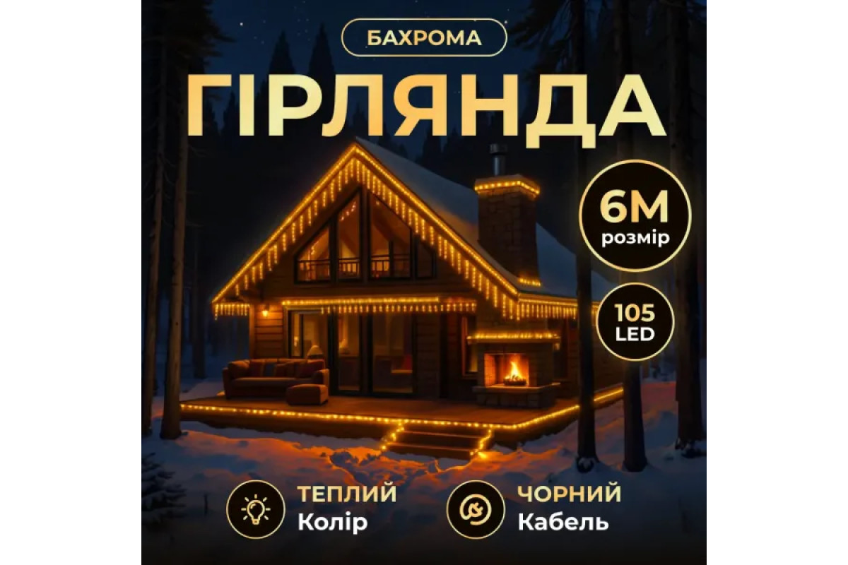 Гірлянда «Бахрома» зі 105 LED лампочками створює атмосферне освітлення для зовнішнього або внутрішнього декору. Довжина основного шнура становить 6 метрів, що дозволяє прикрашати фасади будинків, вікна, балкони, альтанки чи вітрини. Завдяки чорній нитці гірлянда непомітна вдень і виглядає акуратно при монтажі, а в темний час доби рівномірно розсіює світло, створюючи святкову ілюмінацію.