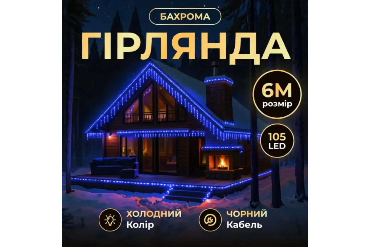 Гірлянда «Бахрома» зі 105 LED лампочками створює атмосферне освітлення для зовнішнього або внутрішнього декору. Довжина основного шнура становить 6 метрів, що дозволяє прикрашати фасади будинків, вікна, балкони, альтанки чи вітрини. Завдяки чорній нитці гірлянда непомітна вдень і виглядає акуратно при монтажі, а в темний час доби рівномірно розсіює світло, створюючи святкову ілюмінацію.