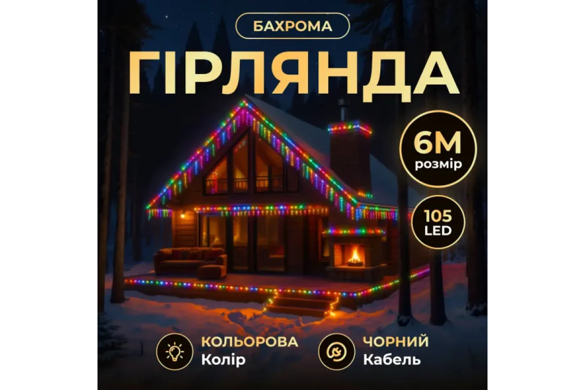 Гірлянда «Бахрома» зі 105 LED лампочками створює атмосферне освітлення для зовнішнього або внутрішнього декору. Довжина основного шнура становить 6 метрів, що дозволяє прикрашати фасади будинків, вікна, балкони, альтанки чи вітрини. Завдяки чорній нитці гірлянда непомітна вдень і виглядає акуратно при монтажі, а в темний час доби рівномірно розсіює світло, створюючи святкову ілюмінацію.
