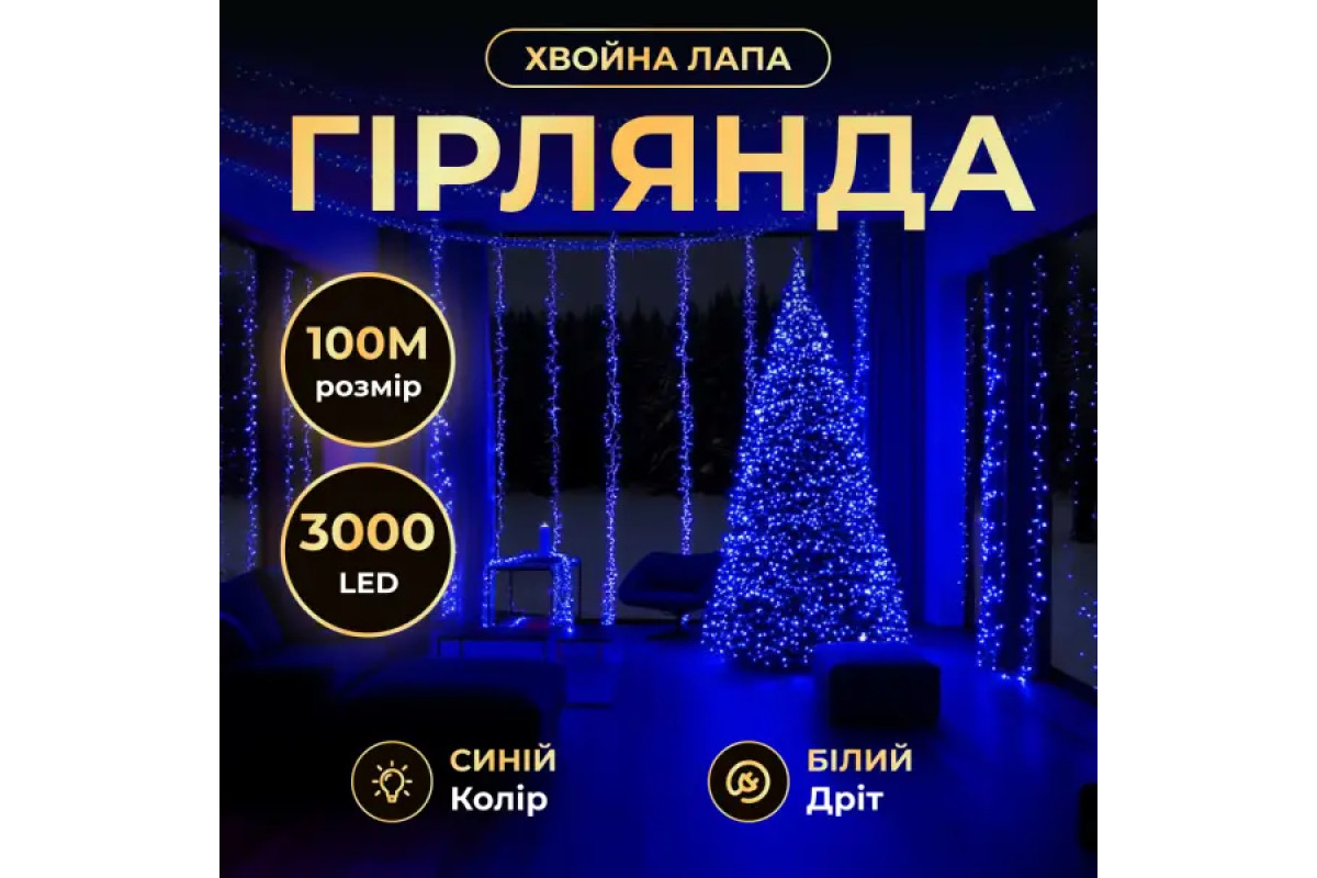 Гірлянда-нитка Роса Хвойна лапа 3000 LED, 100 м, від мережі, білий кабель, синій