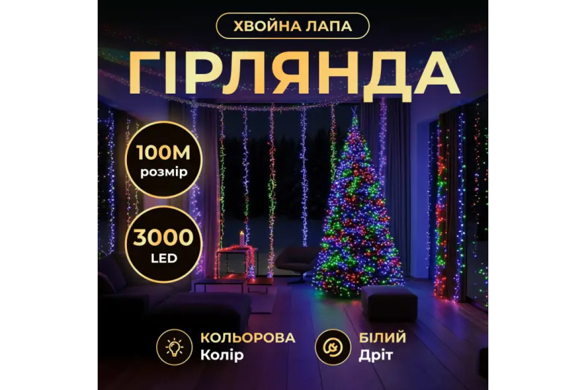 Гірлянда-нитка Роса Хвойна лапа 3000 LED, 100 м, від мережі, білий кабель, мультиколор
