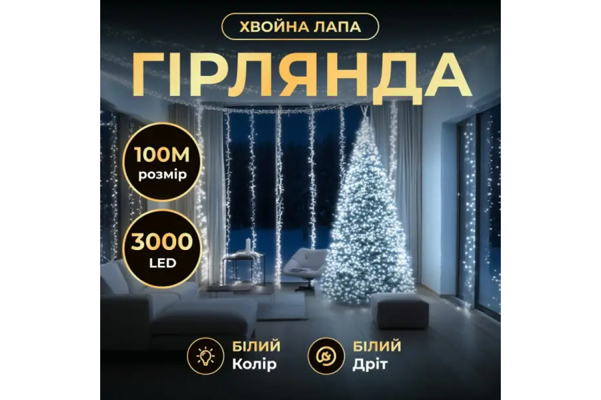 Гірлянда-нитка Роса Хвойна лапа 3000 LED, 100 м, від мережі, білий кабель, білий