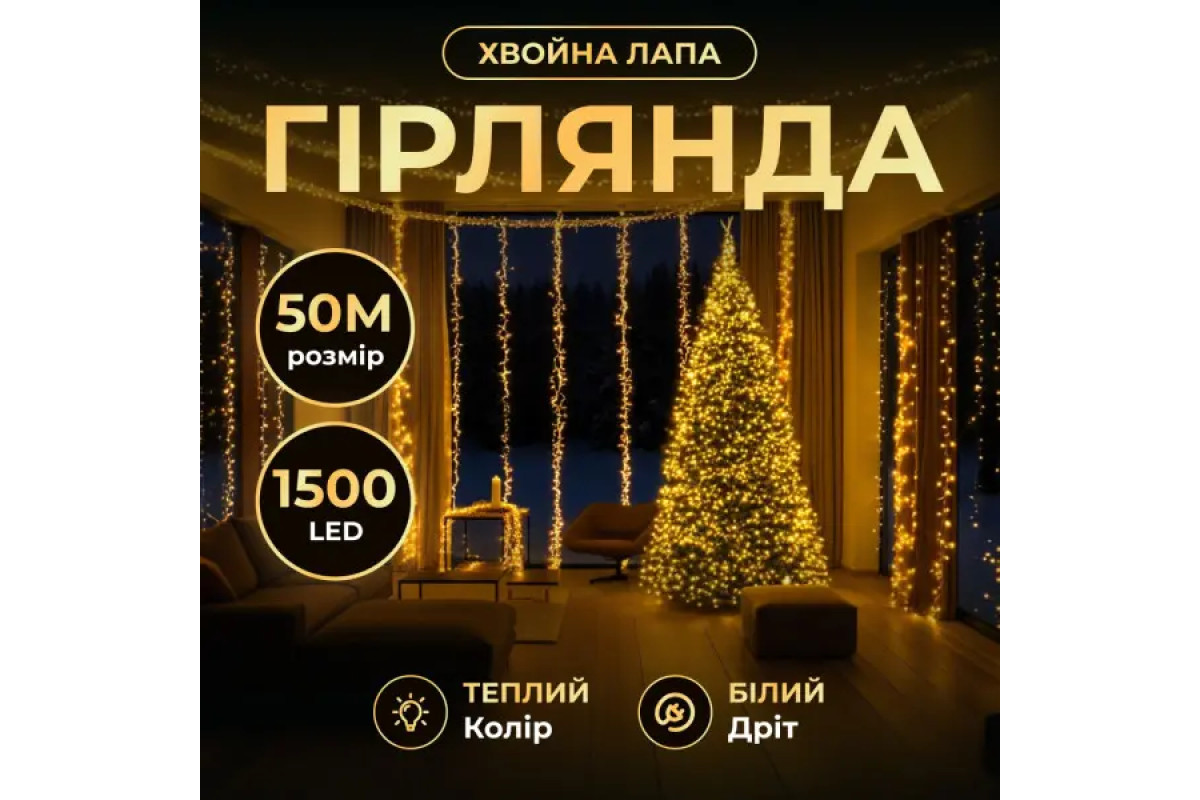 Гірлянда-нитка Роса Хвойна лапа 1500 LED, 50 м, від мережі, білий кабель, жовтий
