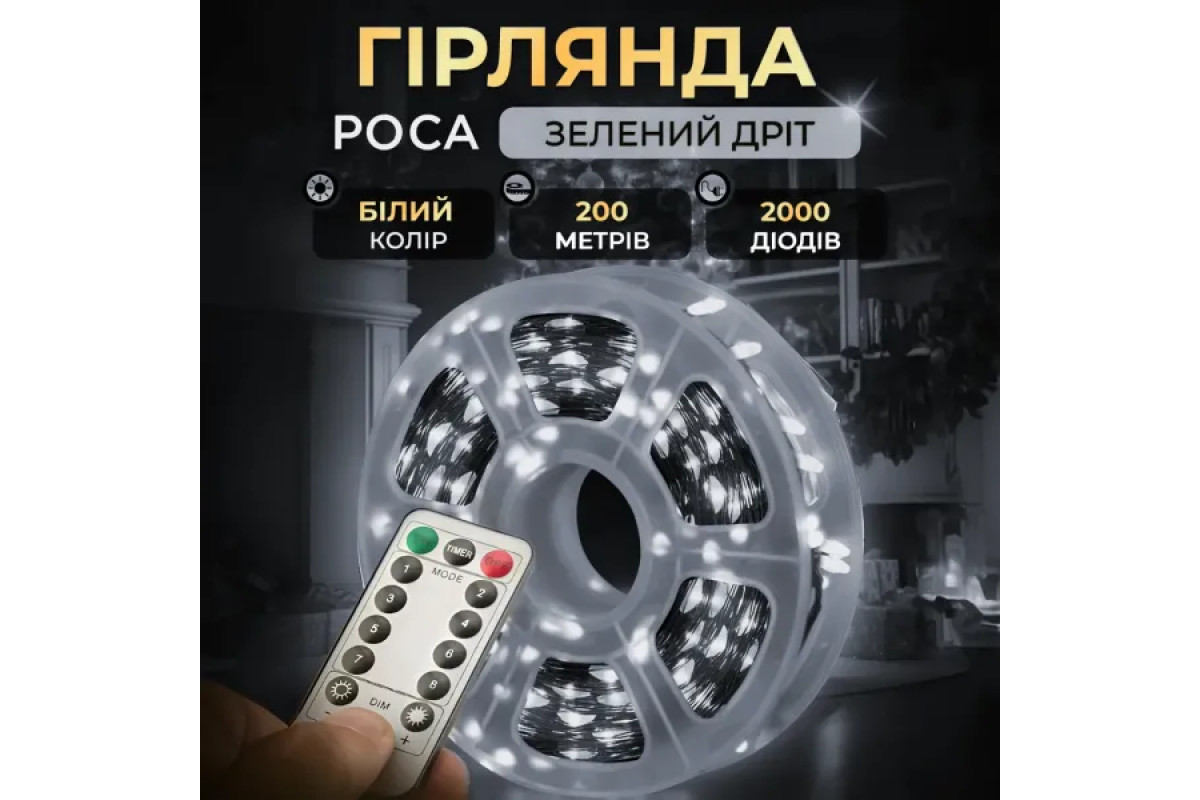 Гірлянда-нитка Роса 2000 LED, 200 м, з пультом, від мережі, зелений кабель, білий