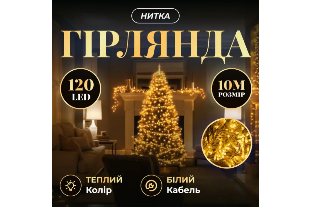 Гірлянда-нитка 120 LED, 10 м, від мережі, прозорий кабель, жовтий