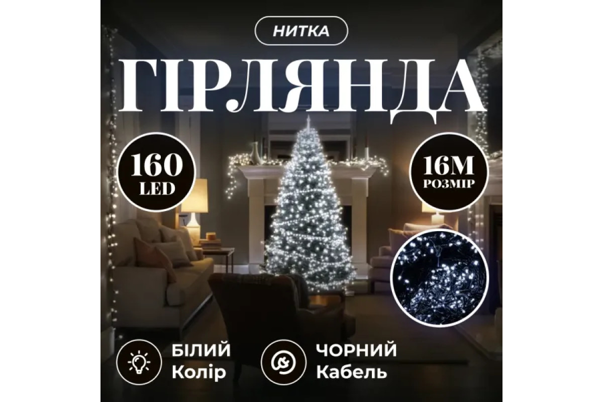 Гірлянда-нитка 160 LED, 16 м, від мережі, чорний кабель, білий