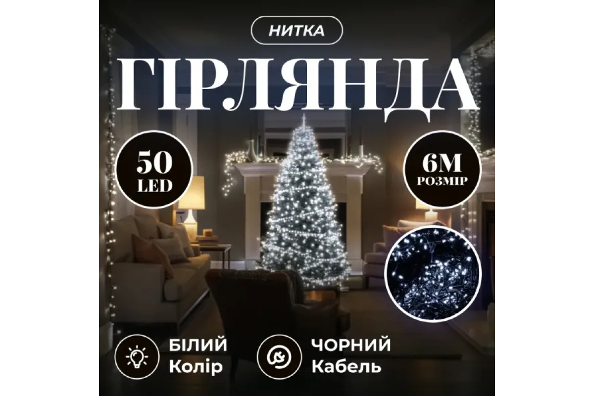 Гірлянда-нитка 50 LED, 6 м, від мережі, чорний кабель, білий