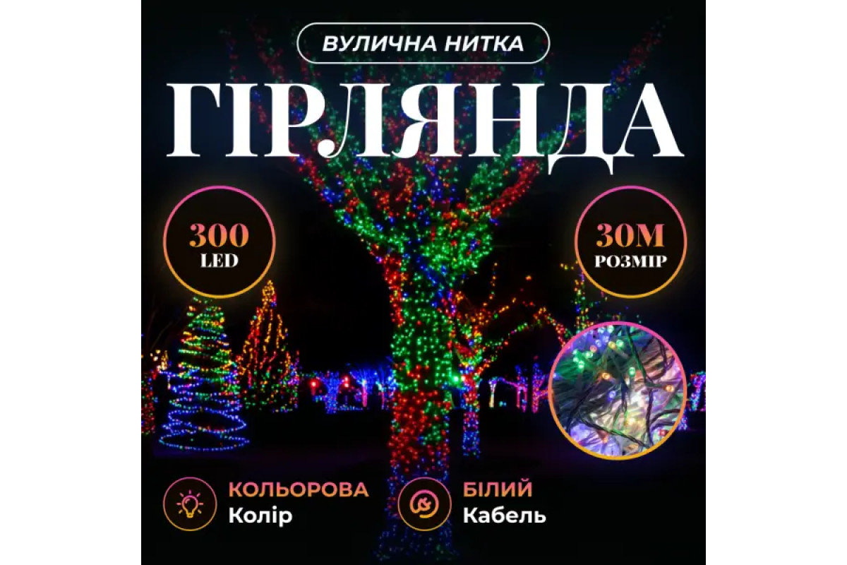 Гірлянда-нитка вулична Різдвяна фея 300 LED, 30 м, від мережі, білий кабель, мультиколор