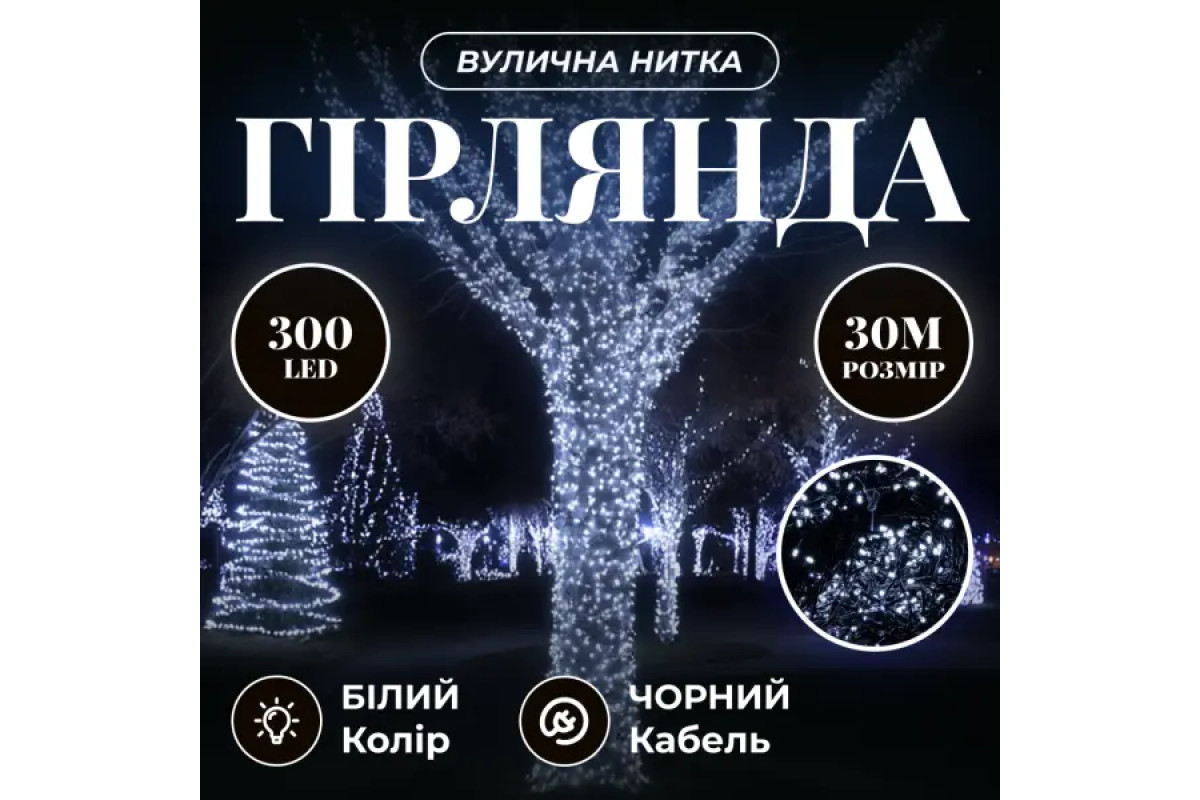 Гірлянда-нитка вулична Різдвяна фея 300 LED, 30 м, від мережі, чорний кабель, білий