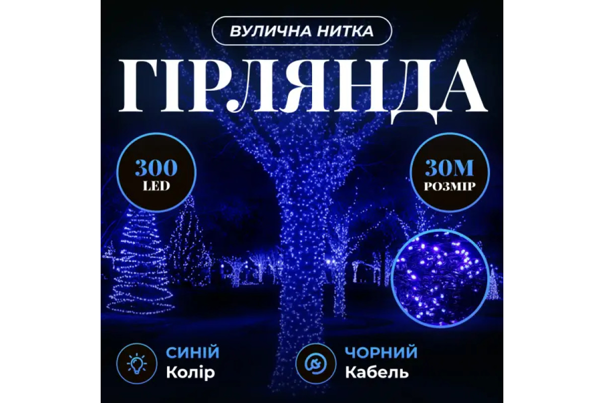 Гірлянда-нитка вулична Різдвяна фея 300 LED, 30 м, від мережі, чорний кабель, синій