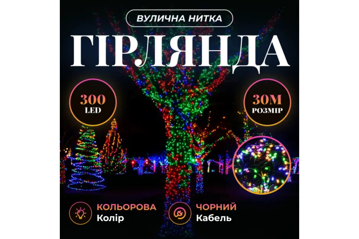 Гірлянда-нитка вулична Різдвяна фея 300 LED, 30 м, від мережі, чорний кабель, мультиколор