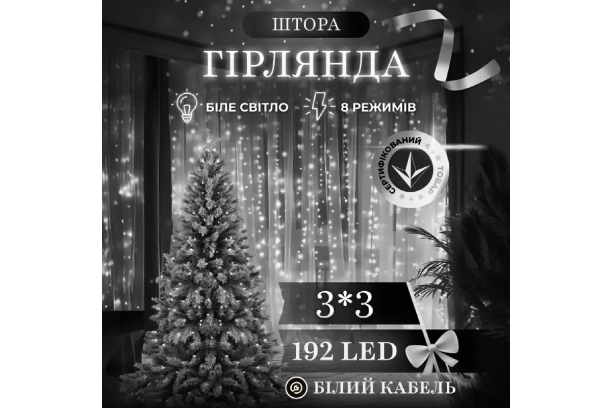 Гірлянда-штора 192 LED, 3х3 м, від мережі, прозорий кабель, білий