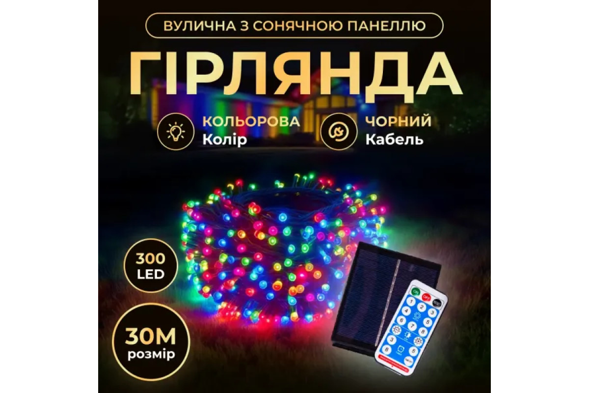 Гірлянда вулична із сонячною панеллю 300 LED, 30 м, чорний кабель, мультиколор