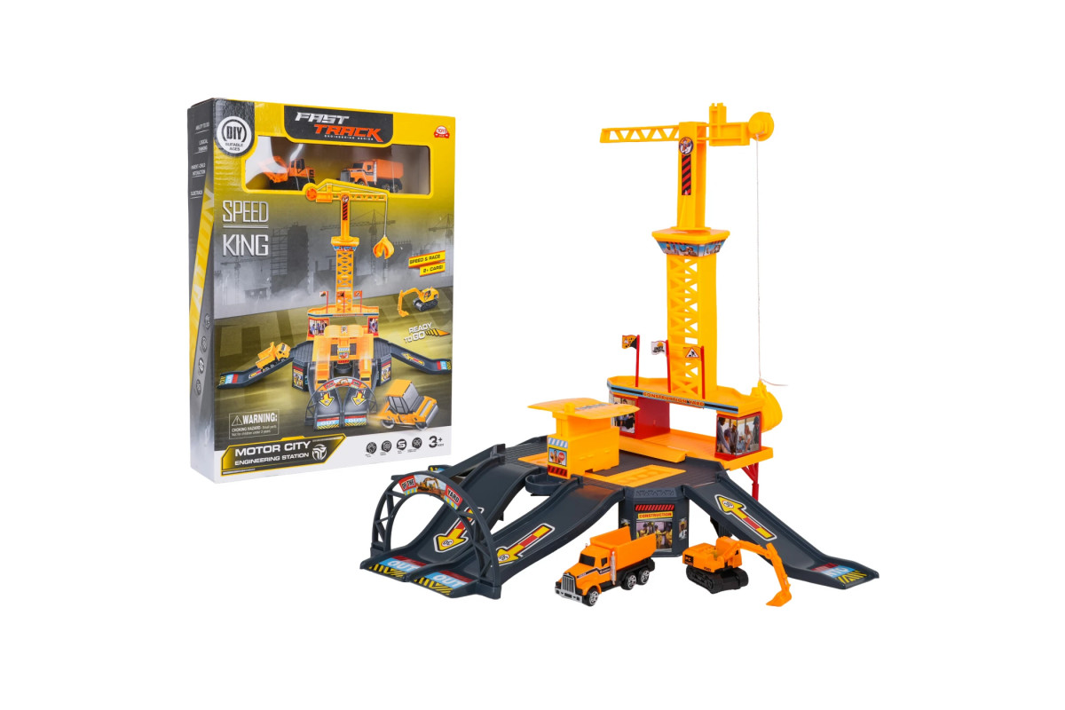 У комплект входить конструкція будівельного майданчика з численними гірками, будівельні транспортні засоби, включаючи вантажівку з металевою кабіною та підйомним причепом, а також кран з рухомою ковшом та ручним захватом.