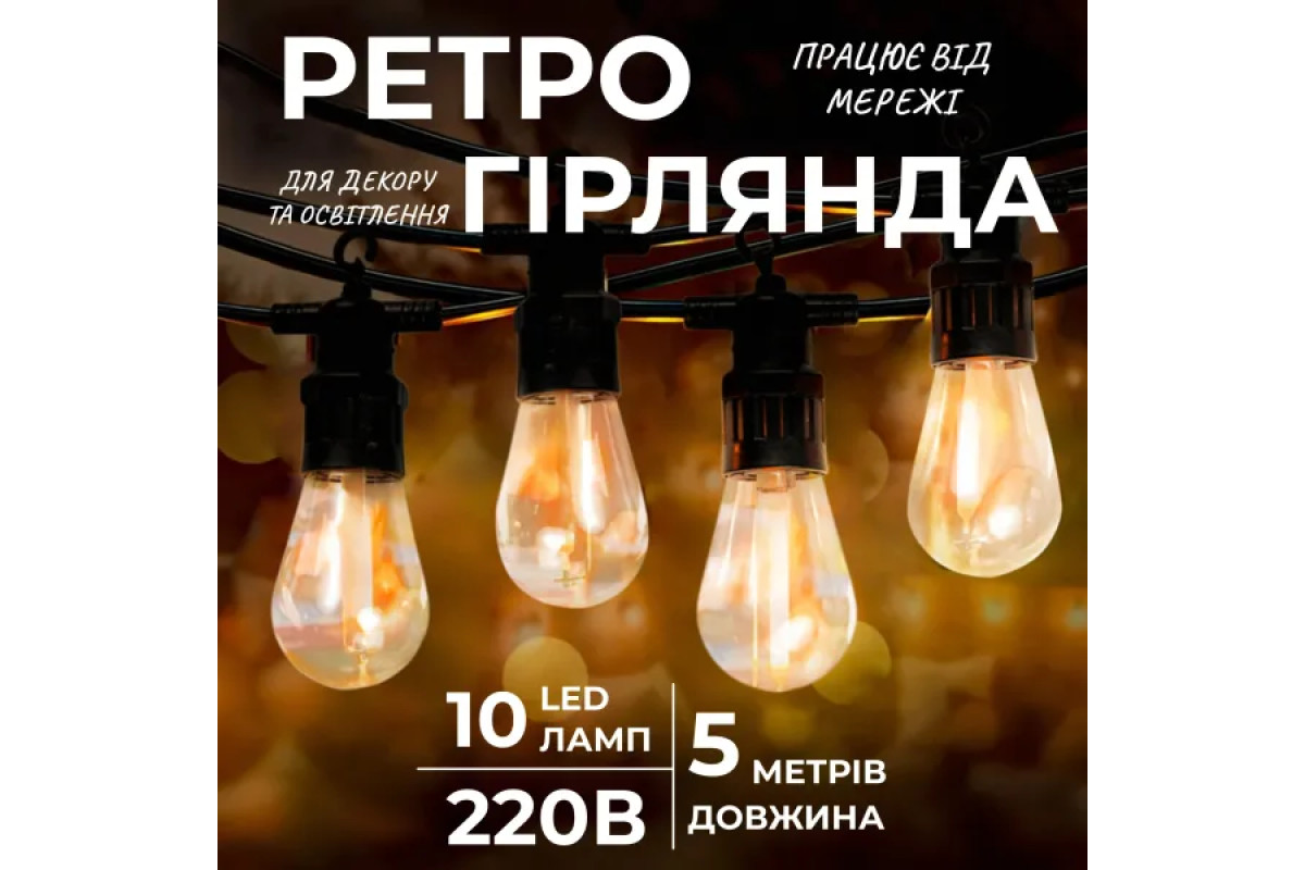 Вулична ретро-гірлянда допоможе створити атмосферу затишку та ностальгії на вашій ділянці. Гірлянда має класичний дизайн і підходить для декорування альтанок, веранд, дерев та кущів, екстер'єру кафе та ресторанів, а також її можна використовувати в приміщенні як стильний елемент інтер'єру або як додаткове джерело освітлення.