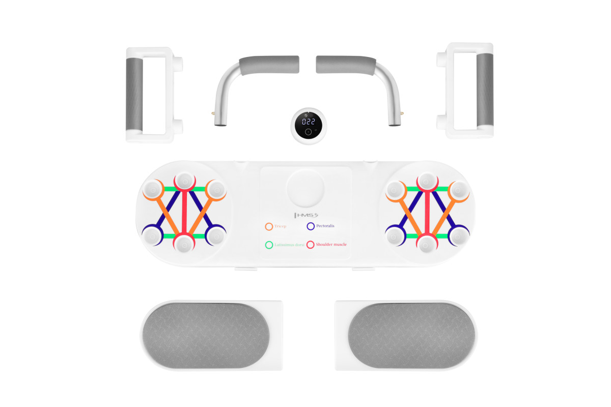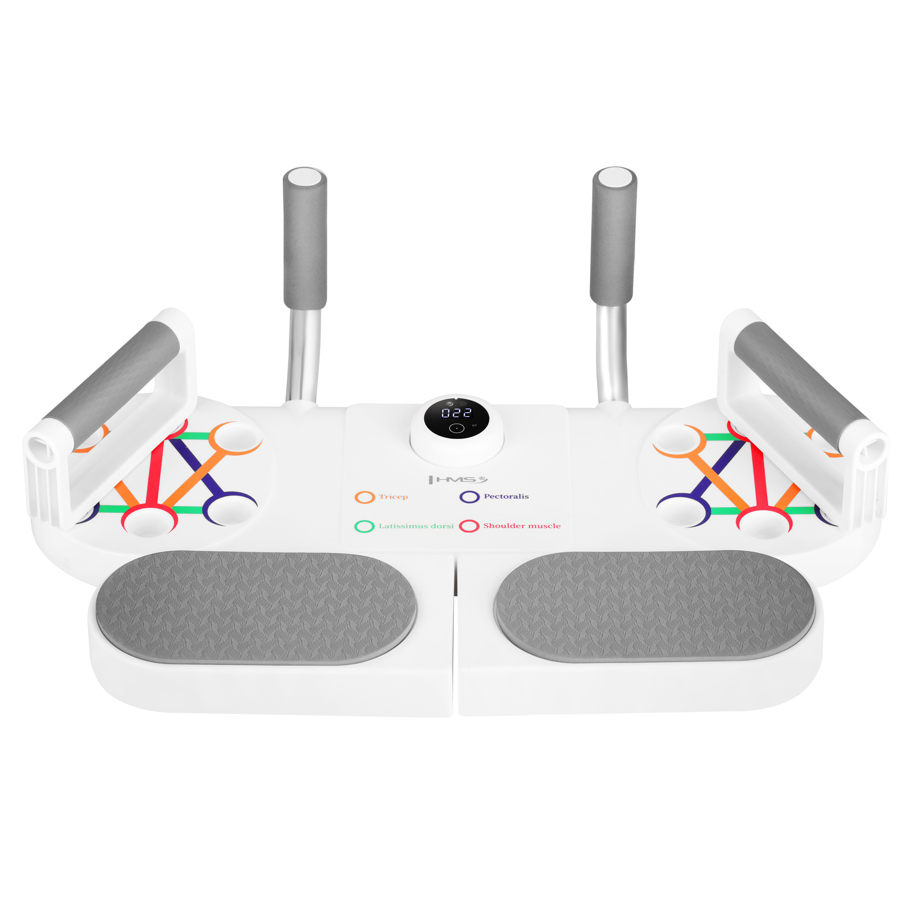 Багатофункціональна платформа HMS DBP03 з лічильником — це компактний прилад для ефективних тренувань вдома, який поєднує стабільну дошку для планки, ручки для віджимань з кількома налаштуваннями та інтелектуальний лічильник з оптичним датчиком наближення, що автоматично підраховує повторення. Вона забезпечує різні варіанти хвату завдяки системі отворів і кольоровим напрямним, що дозволяють налаштовувати ручки під конкретні групи м’язів: груди, плечі, трицепси та спину. Широка плита з пінопластовими прокладками стабілізує планку та вправи для м’язів живота, а антиковзаюча текстура, м’які ручки та жорстка основа гарантують комфорт і безпеку. Тонкий профіль робить платформу зручною для зберігання навіть у невеликих приміщеннях.