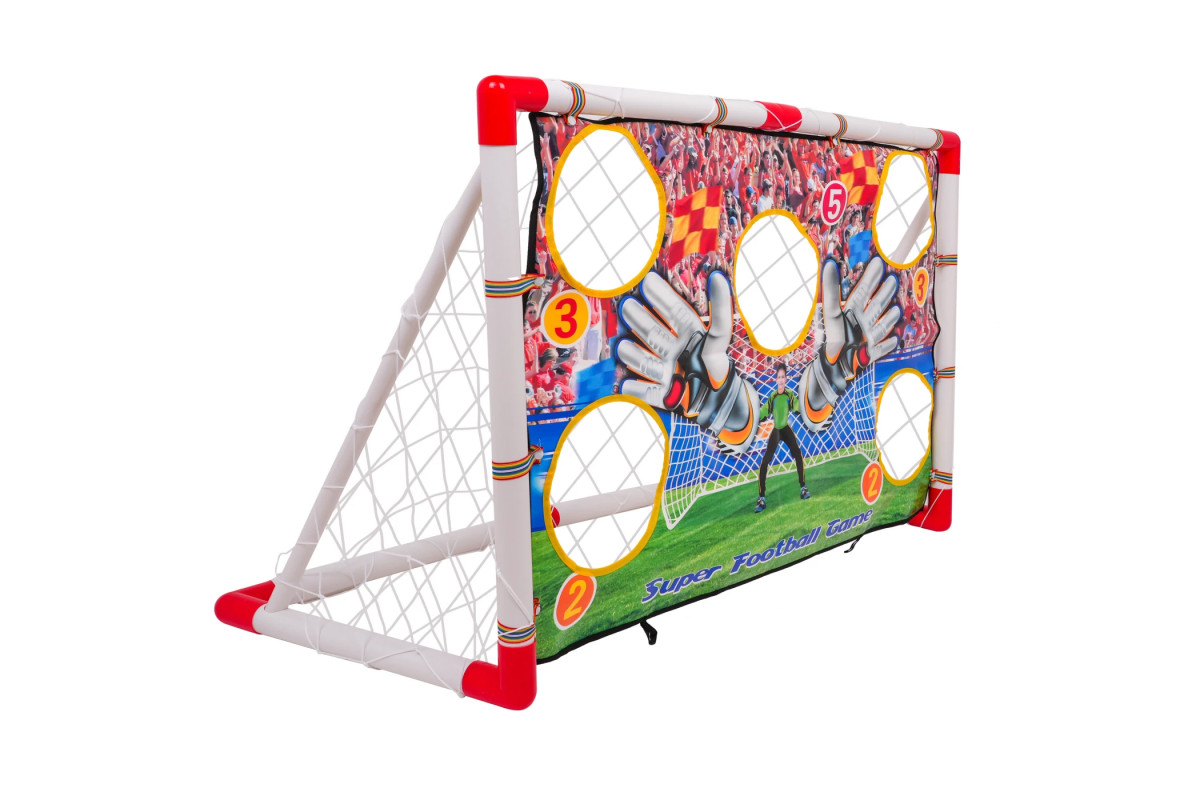 Ворота розміром 116 x 76 x 48 см оснащені міцною сіткою та килимком з отворами для тренування влучності. У комплекті також є м'яч діаметром приблизно 15 см, насос для його надування та кріпильні гаки, які стабілізують ворота під час гри на вулиці.