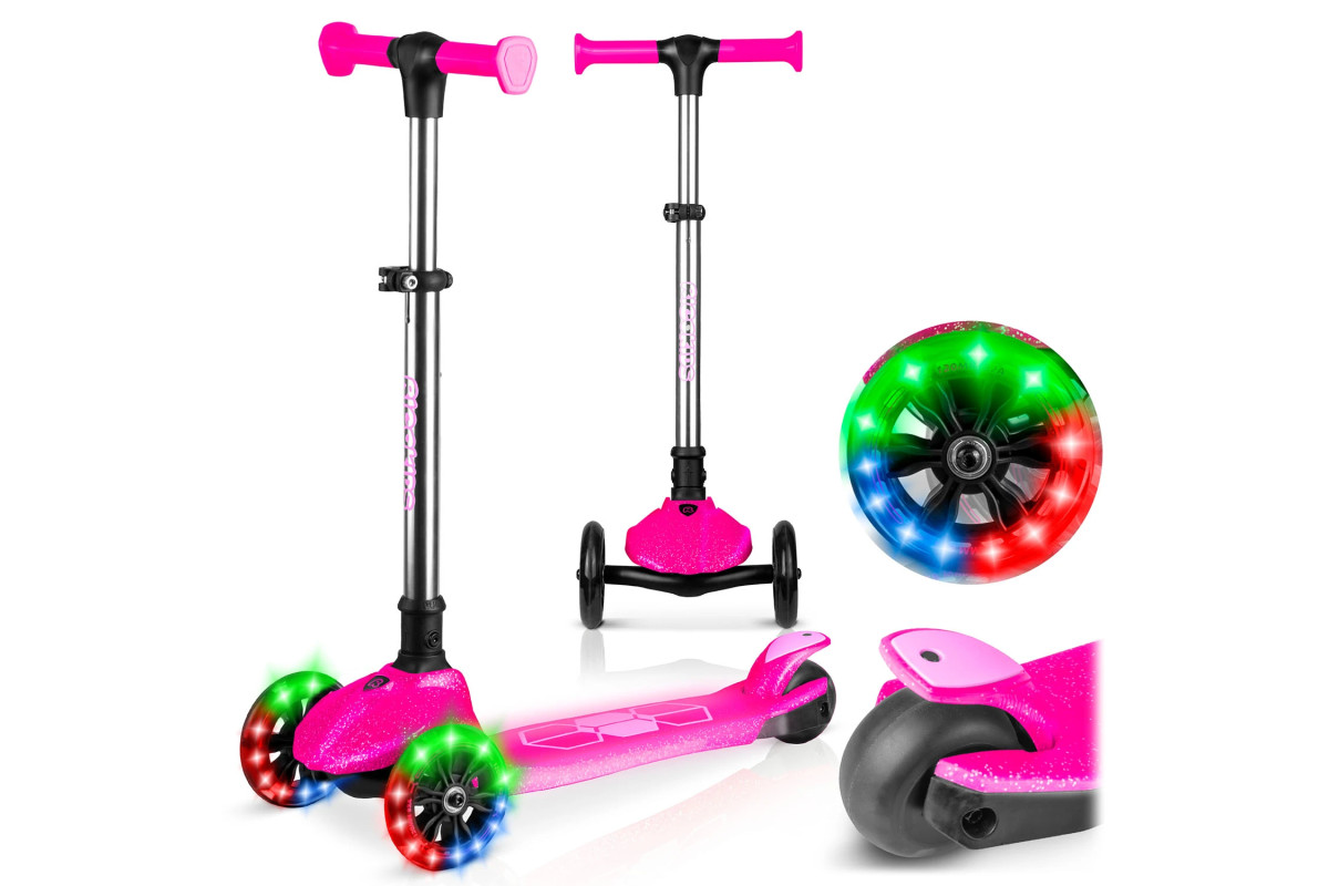 Самокат має вбудований динамо, завдяки чому колеса світяться під час їзди.