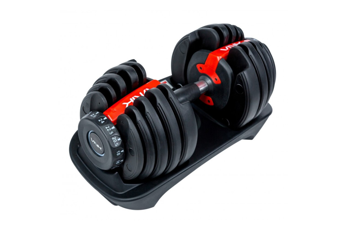 - Тепер Ви легко зможете повноцінно тренуватися навіть удома: пара регульованих гантелей VNK заміняють 15 пар традиційних гантелей. Вага одного снаряда варіюється від 2,5 до 24 кг. Для зміни ваги достатньо одного повороту циферблату.