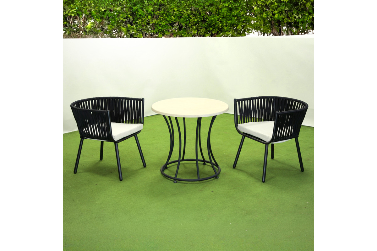 Комплект садових меблів Greengard Лінеа — сучасне та стильне рішення для облаштування тераси, балкона, зони відпочинку чи літнього майданчика. Набір складається з круглого столу та двох крісел у мінімалістичному дизайні. Металевий каркас забезпечує надійність конструкцій, а світла стільниця та м’які подушки створюють приємний контраст і підкреслюють елегантність. Плетені елементи з поліамідної стрічки додають візуальної легкості та роблять комплект практичним для щоденного використання. Матеріали стійкі до зовнішніх впливів, легко очищуються та зберігають привабливий вигляд упродовж тривалого часу.