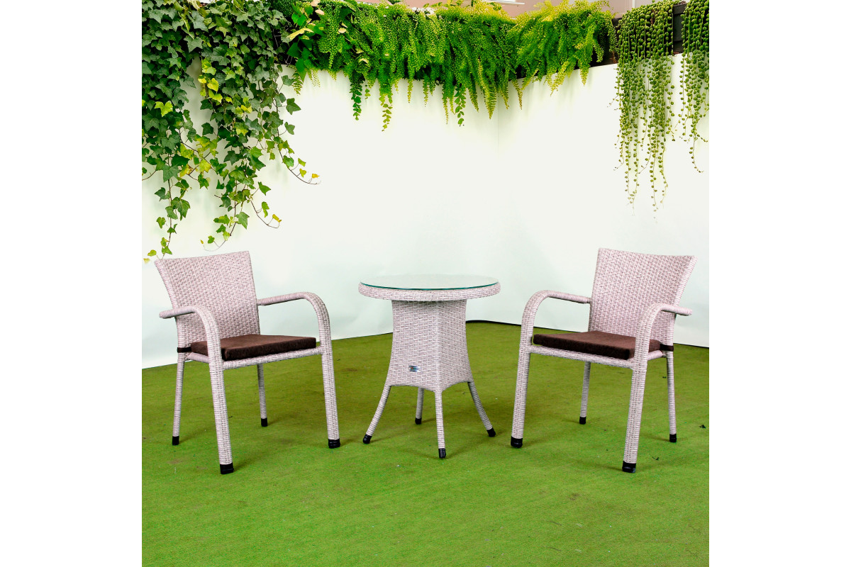 Комплект садових меблів Greengard Терра — стильний та сучасний набір для двох, виконаний із штучного ротангу. Ідеально підходить для облаштування затишного балкона, тераси чи невеликої зони відпочинку. Стільці з підлокітниками мають ергономічну форму, що повторює природне положення тіла, забезпечуючи комфорт під час сидіння. Скляна стільниця столика надійно закріплена та має гладку поверхню. Усі елементи комплекту побудовані на металевому каркасі з полімерним покриттям, що гарантує міцність і довговічність. За бажанням комплект може бути доповнений м’якими подушками.